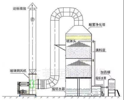 廢氣噴淋流程簡(jiǎn)介:其基本原理是利用氣體與液體間的接觸,而將氣體中的污染物傳送到液體中,然后再將清潔之氣體與被污染的液體分離達(dá)成清潔空氣的目的。氣流中的〔粒狀污染物〕與噴淋液接觸之后,液滴或液膜擴(kuò)散附於氣流粒子上,或者增濕於粒子,使粒子借著重力、慣性力等作用達(dá)到分離去除之目的,〔氣態(tài)污染物質(zhì)則借著紊流、分子擴(kuò)散等質(zhì)量傳送以及化學(xué)反應(yīng)等現(xiàn)象傳入噴淋洗中達(dá)到與進(jìn)流氣體分離之目的,并可在噴淋液中添加化學(xué)物質(zhì),以吸收方式控制氣狀臭味物質(zhì),廢氣經(jīng)由填充式噴淋塔,采氣液逆向吸收方式處理,即液體自塔頂向下以霧狀(或小水滴)噴灑而下,廢氣則由塔底(逆向流)達(dá)到氣液接觸之目的,此處理方式,可冷卻廢氣溫度、氣體調(diào)整、及顆粒去除。再經(jīng)過(guò)除霧段處理后排入大氣中。